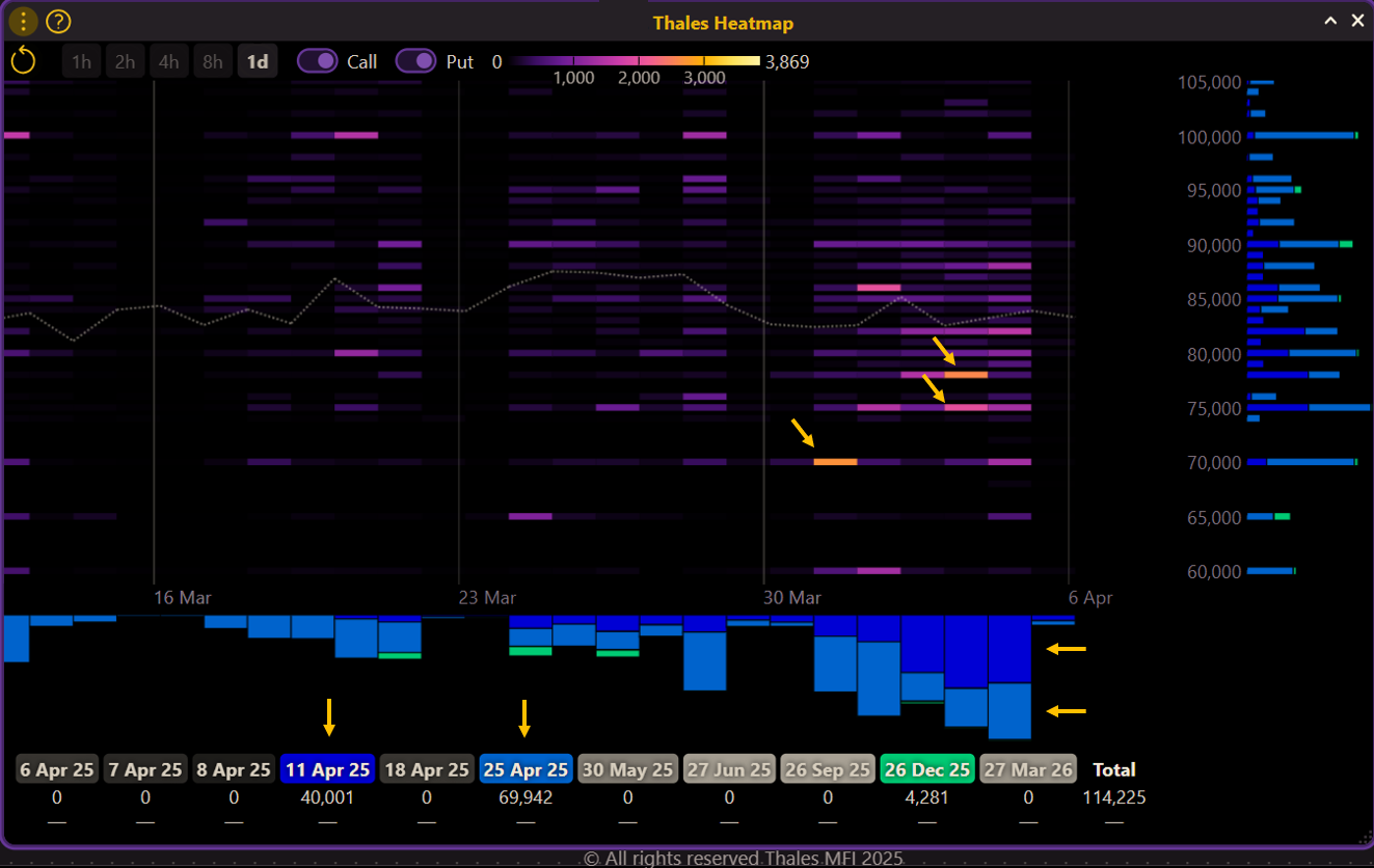 The Thales Heatmap offers a visual representation of where trading activity is concentrated across different strike prices and expiries. In this view, we’ve filtered for three key maturities—April 11, April 25, and December 26—to observe sentiment across short-, mid-, and long-term horizons.