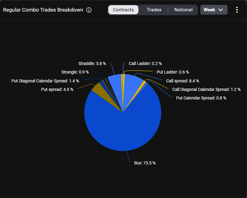Earlier in this report, we observed a cluster of balanced call and put open interest around the mark price. At first glance this might look like a typical straddle, but Deribit’s Regular Combo Trades Breakdown tells a different story. In the past week, nearly 75% of all multi-leg trades were Box Spreads—a classic arbitrage structure.