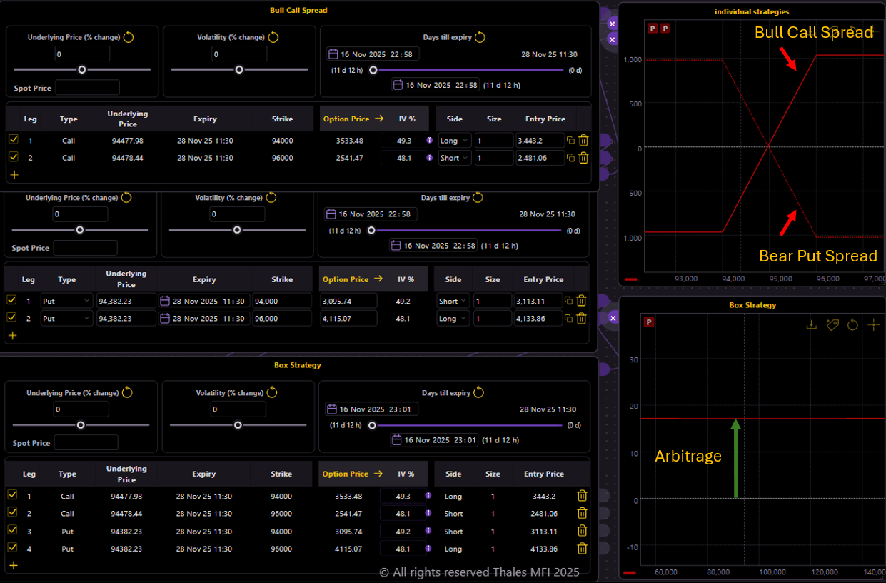 A Box Spread combines two opposing vertical spreads using both calls and puts. For example, with BTC trading near $95,000, a trader may buy the 94K call and sell the 96K call, while simultaneously selling the 94K put and buying the 96K put. (see the simulation below)