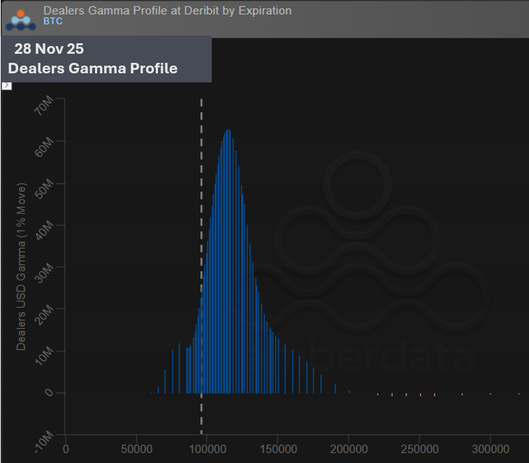 The dealer gamma profile for the 28 Nov expiry is broadly positive, with its strongest concentration at strikes between 100K and 130K. A positive gamma profile indicates that dealers are long gamma, which means the market—on aggregate—has been selling options at these upper strikes. This positioning aligns well with the probability distribution discussed earlier: traders collectively signal that levels above 100K are unlikely to be reached by month-end. The profile reinforces the idea of a market leaning defensively, pricing in capped upside and prioritizing protection rather than aggressive bullish structures.