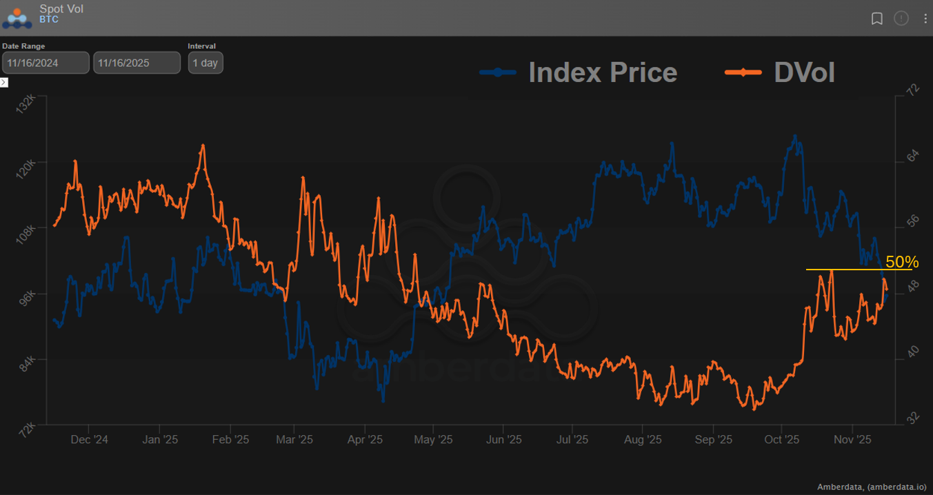 This helps solve the puzzle of why Bitcoin’s implied volatility repeatedly stalls around 50%, even during sharp market swings.