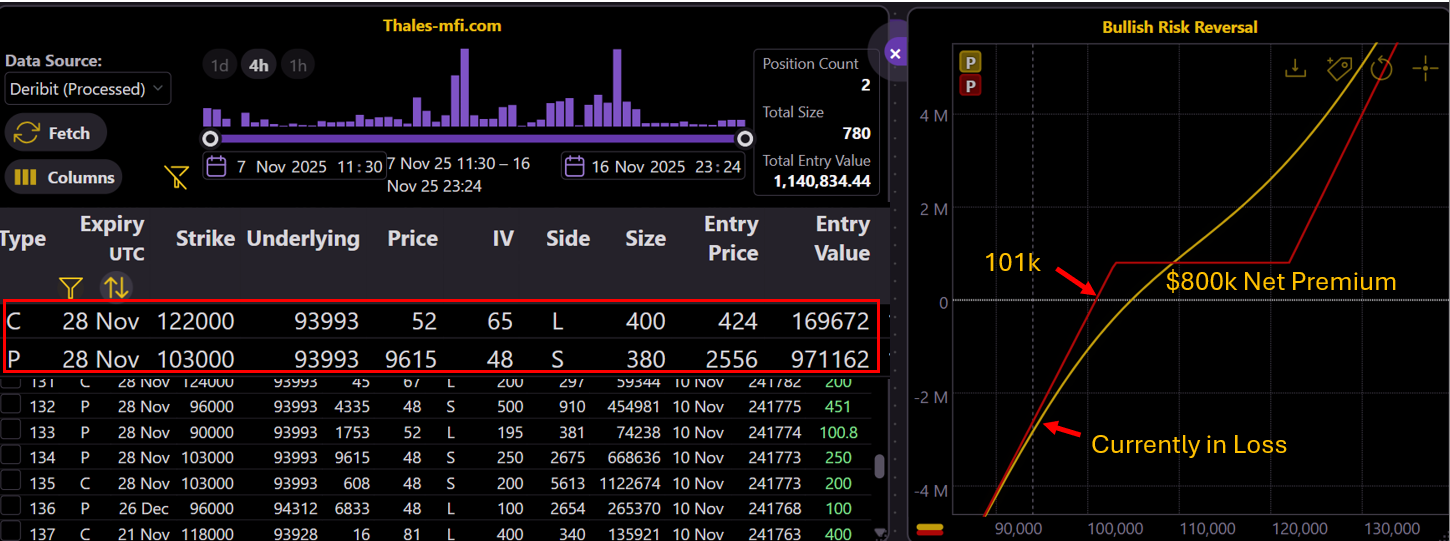 Another spotted strategy in our Market Screener this is a bullish risk-reversal built through selling 380 put options at $103,000 and buying 400 call options at $122,000 for the 28 November expiry. The structure is a credit trade, with the trader already collecting roughly $800,000 in net premium. Functionally, this position behaves like a synthetic long, financing upside exposure by taking on downside risk.