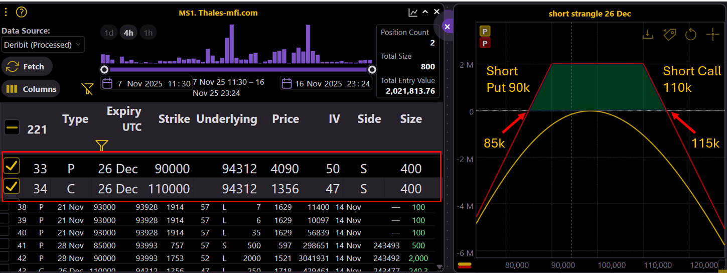 In this week’s snapshot, we identified a sizeable 800-contract short strangle set for 26 December (the final expiry of 2025). The structure consists of selling 400 puts at $90,000 and 400 calls at $110,000, creating a classic range-bound premium-harvesting position (collecting $2M premium).