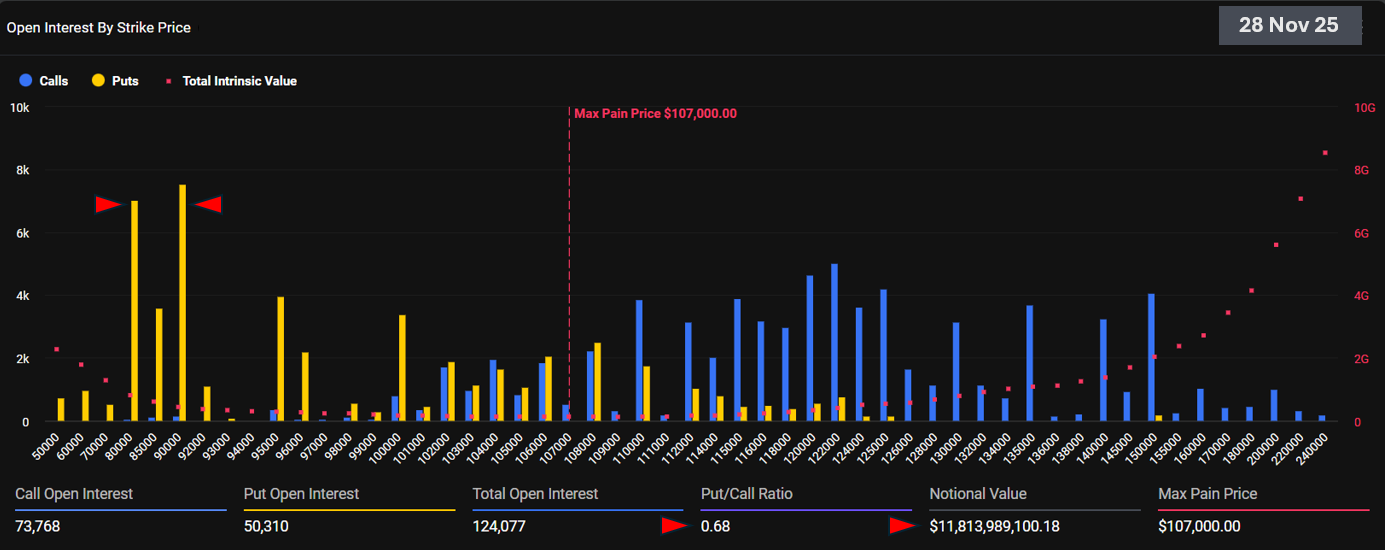 For a broader view of positioning beyond the immediate week, the 28 November expiry stands out with nearly $12 billion in notional open interest and a put/call ratio near 0.70. The structure is dominated by two large put positions at 80K and 90K, creating a notable gap between put-heavy lower strikes and the call-dense upper range. With max pain at $107K—well above the current ~$97K spot—the skew clearly reflects downside concern and cautious positioning.