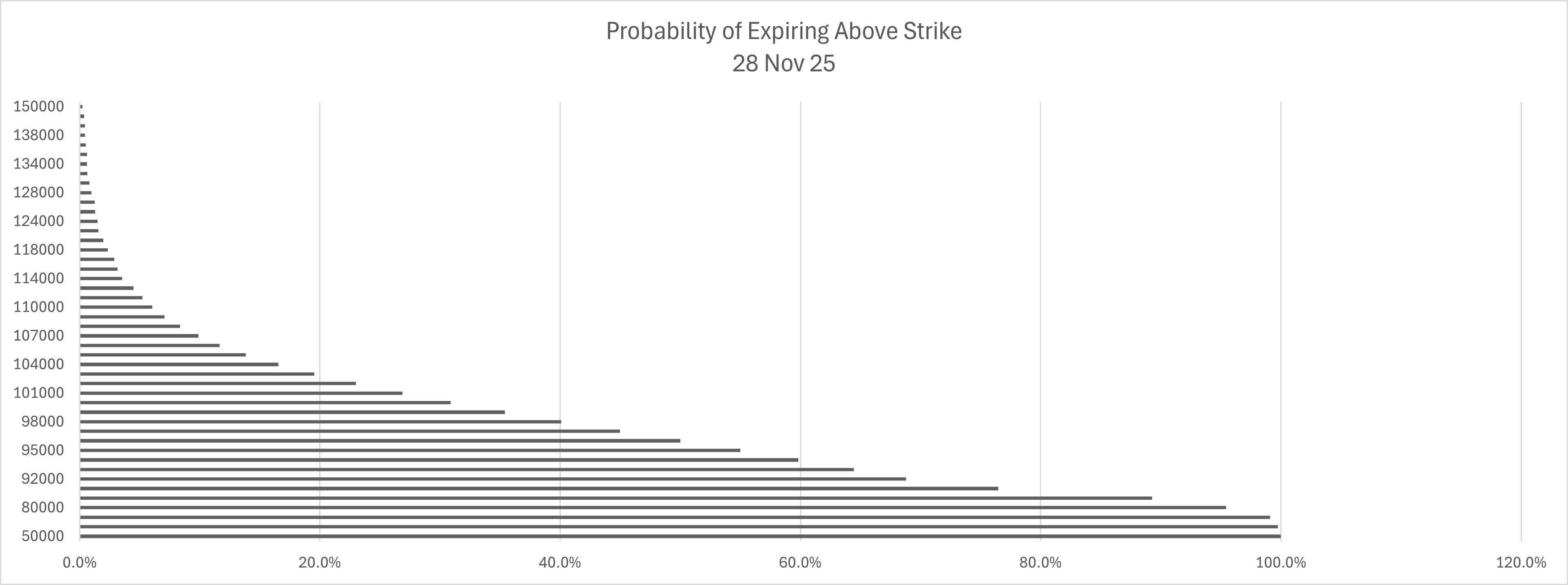 The probability chart reinforces this sentiment: for strikes above $100K, the likelihood of finishing in the money is currently below 25%, while put strikes at 95K and 100K remain influential. Still, the options market is highly dynamic, and these probability distributions can shift quickly as volatility and spot price evolve.
