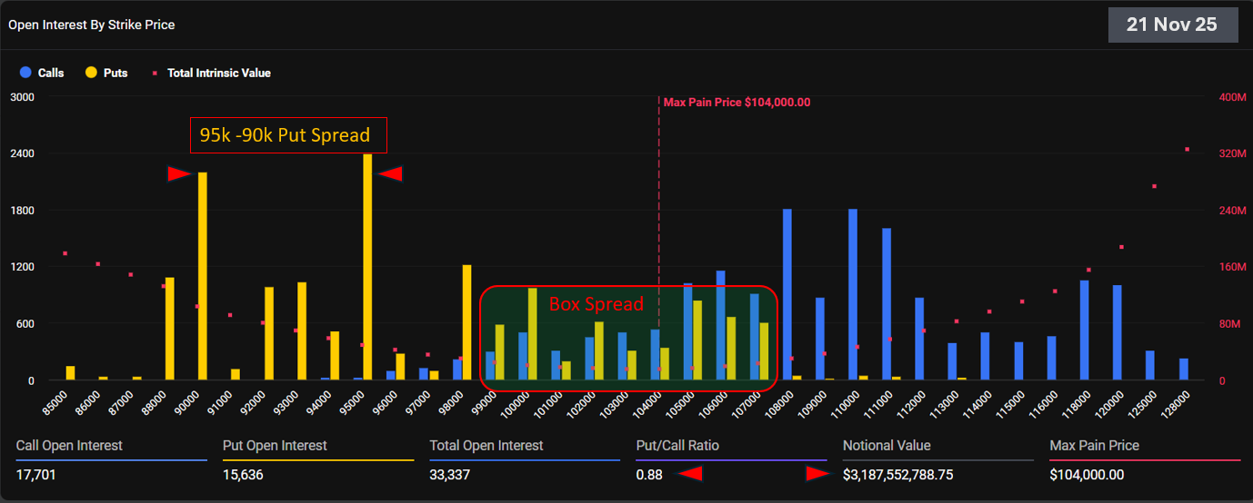 Bitcoin’s decisive move below the long-held $100,000 support has pushed the options market into a period of recalibration rather than panic, revealing how much the landscape has evolved. Last week’s $97,200 settlement exposed persistent downside pressure, yet implied volatility remains capped near 50%—a clear signal that a deep pool of institutional volatility sellers and arbitrage desks is actively absorbing demand. Across maturities, we see renewed put-spread hedging, concentrated downside protection, and a surge in box-spread activity, while selected directional traders pursue range-bound short-vol structures or low-cost bullish expressions. Together, these flows highlight a market that is becoming more structured, more sophisticated, and increasingly driven by disciplined premium-selling and arbitrage, rather than reactive speculation.